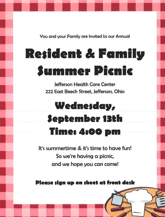 Jefferson Healthcare Center is wrapping up summer with our Resident & Family Summer Picnic on Wednesday, September 13th, at 4pm! Our residents and families are invited to join us for a lovely evening together. Please RSVP to 440-576-0060 or at the front desk if you plan on attending. We'll see you there!